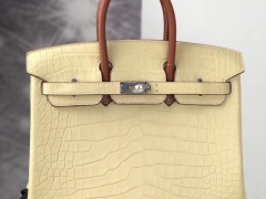 Hermès(爱马仕)Birkin 25cm Alligator matt 雾面鳄鱼 Y1香草色拼马鞍皮金棕色 银扣 顶级手缝 定制