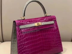 Hermès(爱马仕)Kelly 25cm 亮面鳄鱼J5 天方夜谭粉紫 拼Ck81 斑鸠灰 Gris T 金扣 马蹄印 超美现货
