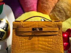 Hermès(爱马仕)Mini kelly pochette 22cm Alligator shiny 亮面鳄鱼 琥珀黄 Ambre 金扣 晚宴包 拱珠现货