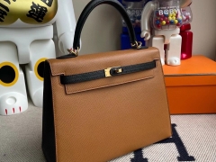Hermès(爱马仕)kelly 25cm Epsom 原厂掌纹皮 ck37 金棕色Gold 拼ck89 黑色 拉丝金扣 马蹄印 现货