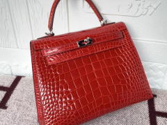 Hermès(爱马仕)Kelly 25cm Crocodile shiny 亮面鳄鱼 美洲法拉利红 银扣 现货