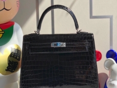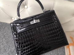 Hermès(爱马仕)Kelly 25cm Crocodile shiny 亮面鳄鱼 ck89 黑色 Noir 银扣 顶级手缝 现货