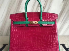 Hermès(爱马仕)Birkin25cm Crocodile shiny 亮面鳄鱼 J5 天方夜谭粉拼翡翠绿 马蹄印 金扣