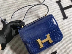 Hermès(爱马仕)Constance 空姐包 亮面方块 美洲鳄鱼 CK73宝石蓝 Blue Sapphire 完美品相 金扣 19cm