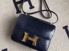 Hermès(爱马仕)极品空姐包Constance 宝蓝色 亮面鳄鱼 金扣 19cm 现货