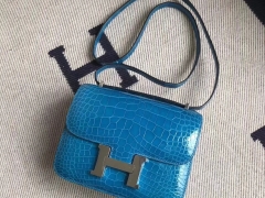 Hermès(爱马仕)Constance 空姐包 亮面方块 美洲鳄鱼 7W伊兹密尔蓝 Blue izmir 完美品相 银扣 19cm