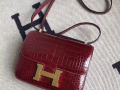 Hermès(爱马仕)Constance 空姐包 亮面方块 美洲鳄鱼 F5勃艮第酒红 Bourgogne 完美品相 金扣 19cm 现货