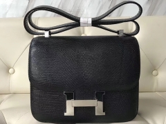 Hermès(爱马仕)Constance24cm lizard 进口亮面蜥蜴皮 ck89 黑色 银扣
