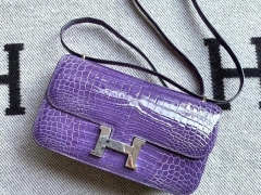 Hermès(爱马仕)Constance空姐包 水晶紫亮面鳄鱼皮 银扣 26cm