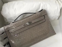 Hermès(爱马仕)Minikelly pochette 亮面鳄鱼 ck81 斑鸠灰 Gris T 银扣 22cm 手拿包