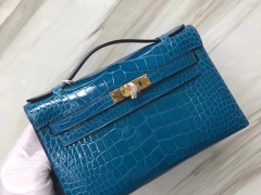 Hermès(爱马仕) Minikelly pochette Alligator shiny 亮面鳄鱼 7W 伊兹密尔蓝 Blue izmir 金扣 手拿包 晚宴包 22cm