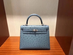 Hermès(爱马仕)Kelly凯莉包 Ostrich kk鸵鸟 8U 冰川蓝 blue glacier 银扣 25cm 现货