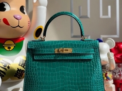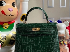 Hermès(爱马仕)Kelly 28cm porosus shiny 亮面澳洲湾鳄 6Q翡翠绿 金扣 顶级手缝 现货
