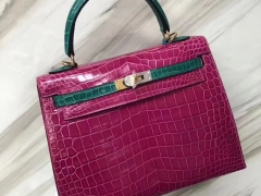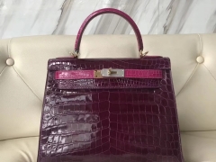 Hermès(爱马仕)Kelly shiny crocodile 亮面尼罗鳄 N5加仑紫拼J5天方夜谭粉紫 金扣 28cm