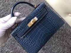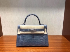 Hermès(爱马仕)Mini Kelly 19cm crocodile 亮面框框美洲鳄 牛仔蓝 蜡线全手工 银扣