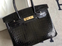 Hermès(爱马仕)Birkin 铂金包 crocodile 亮面两点汨罗鳄 ck89黑色 蜡线全手工 金扣 30cm