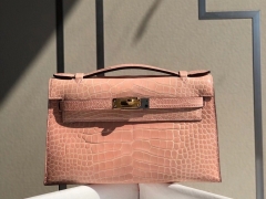 Hermès(爱马仕)Mini Kelly pochette 22cm Alligator shiny 亮面鳄鱼 1Q奶昔粉 金扣 顶级手缝 现货