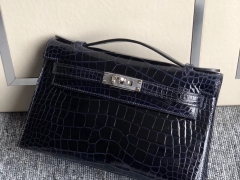 Hermès(爱马仕)Mini kelly pochette 22cm 亮面鳄鱼 宝石蓝 银扣 手拿包 晚宴包 现货