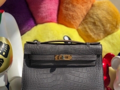 Hermès(爱马仕)Mini kelly pochette 22cm Alligator shiny 亮面鳄鱼 慕斯灰 金扣 晚宴包 顶级手缝 现货