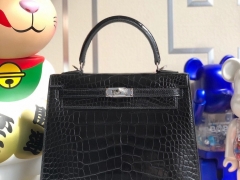 Hermès(爱马仕)Kelly 25cm Alligator shiny 亮面鳄鱼 ck89黑色 Noir 银扣 顶级手缝 现货