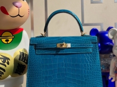 Hermès(爱马仕)Kelly 25cm Porosus shiny 亮面澳洲湾鳄 7Q希腊蓝 Mykonos 金扣 顶级手缝 现货