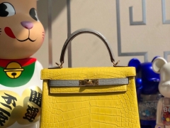 Hermès(爱马仕)Kelly 25cm Alligator matt 雾面鳄鱼 M9 金盏花黄拼4Z海鸥灰 金扣 马蹄印 顶级手缝 现货 Hermès(爱马仕)Kelly 25cm Alligator shiny 亮面鳄鱼 ck81 斑鸠灰 银扣 顶级手缝  现货