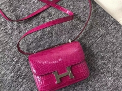 Hermès(爱马仕)Mimi Constance 迷你空姐包 亮面框框美洲鳄 J5天方夜谭粉紫 蜡线全手工 银扣 14cm