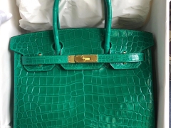 Hermès(爱马仕)Birkin 30cm Crocodile shiny 亮面鳄鱼 7Q 翡翠绿 金扣 顶级手缝 现货