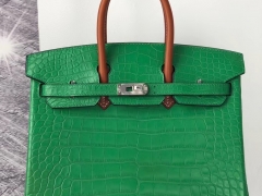 Hermès(爱马仕)Birkin 25cm Alligator matt 雾面鳄鱼 仙人掌绿拼马鞍皮金棕色 银扣 顶级手缝 现货