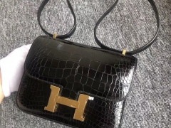 Hermès(爱马仕)Constance 空姐包 shiny alligator crocodile 亮面鳄鱼 Ck89黑色 蜡线全缝 金扣 19cm