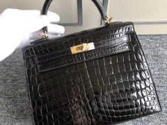 Hermès(爱马仕)Kelly 25cm Crocodile shiny 亮面鳄鱼 ck89 黑色 Noir 金扣 顶级手缝