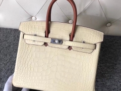 Hermès(爱马仕)Birkin 25cm Alligator matt 雾面鳄鱼 Y1香草色 拼马鞍皮金棕色 银扣 顶级手缝 现货