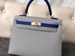 Hermès(爱马仕)Kelly 25cm Eposm 原厂掌纹皮 8U 冰川灰拼7T 电光蓝 金扣 马蹄印 顶级手缝