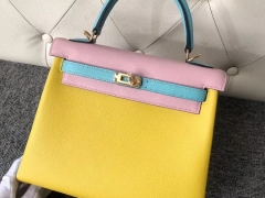 Hermès(爱马仕)Kelly 25cm evecolor 小牛皮 柠檬黄拼奶昔粉拼孔雀蓝 金扣 马蹄印