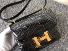 Hermès(爱马仕)Constance 18cm Alligator shiny 亮面鳄鱼 黑色 金扣 顶级手缝 现货