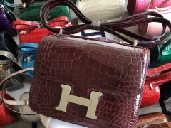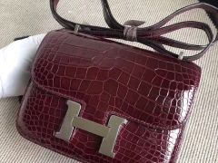 Hermès(爱马仕)Constance 空姐包 18cm Alligator shiny 亮面鳄鱼 酒红色 银扣 现货