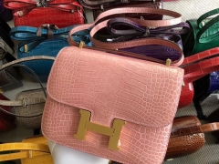 Hermès(爱马仕)Constance 空姐包 18cm Alligator shiny 亮面鳄鱼 1Q 奶昔粉 金扣 现货