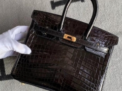 Hermès(爱马仕)Birkin 铂金包 ck89黑色 亮面澳洲湾鳄 蜡线全手工 金扣 25cm