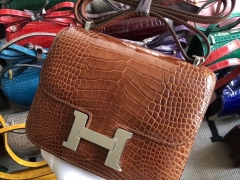 Hermès(爱马仕)Constance 空姐包 18cm Alligator shiny 亮面鳄鱼 ck31 蜜糖棕 银扣 现货