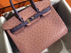 Hermès(爱马仕)Birkin 铂金包 30cm Ostrich kk 鸵鸟 cc94陶瓷粉明+蓝色 金扣 马蹄印