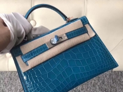 Hermès(爱马仕)Minikelly ll Alligator shiny 亮面鳄鱼 7w 伊兹密尔蓝 银扣 现货