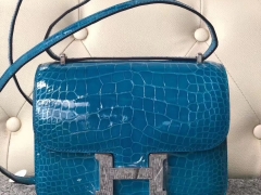 Hermès(爱马仕)Constance 空姐包 Alligator shiny 亮面鳄鱼 7w 伊兹密尔蓝 银扣 18cm