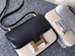 Hermès(爱马仕)Constance 空姐包 lizard 进口亮面蜥蜴 ck89 黑色 noir 金扣 24cm