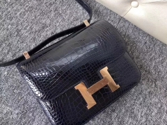 Hermès(爱马仕)Constance 空姐包 Alligator shiny 亮面鳄鱼 2Z 午夜蓝 玫瑰金 Rose gold 24cm