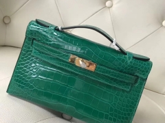 Hermès(爱马仕)Minikelly pochette 亮面鳄鱼 6Q 翡翠绿 金扣 手拿包 晚宴 22cm