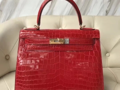 Hermès(爱马仕)Kelly Crocodile shiny 亮面鳄鱼ck95 法拉利红 Braise 金扣 28cm