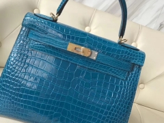 Hermès(爱马仕)Kelly Porosus shiny 亮面澳洲湾鳄 7w 伊兹密尔蓝 Blue izmir 金扣 28cm