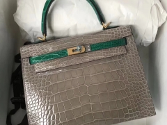 Hermès(爱马仕)Kelly Alligator shiny 亮面鳄鱼 Ck81 斑鸠灰 Gris T 6Q 翡翠绿 金扣 25cm