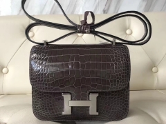 Hermès(爱马仕)Constance Alligator shiny 亮面鳄鱼 ck88 石墨灰 Graphite 银扣 18cm