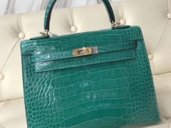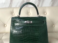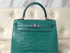 Hermès(爱马仕)Kelly25cm Alligator shiny 亮面鳄鱼 ck67 祖母绿 vert fonce 银扣